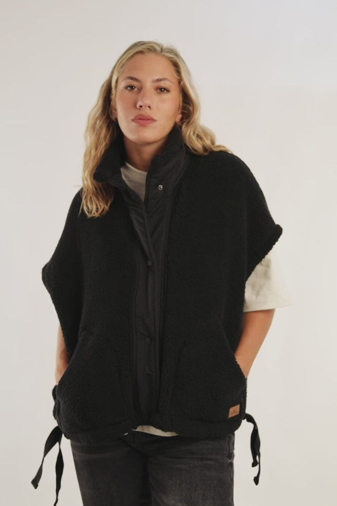 El chaleco tipo capa en tejido sherpa es una prenda versátil que combina abrigo liviano y estilo urbano. Con calce oversize y diseño sin mangas, ofrece máxima comodidad y libertad de movimiento, ideal para sumar una capa extra en días frescos.